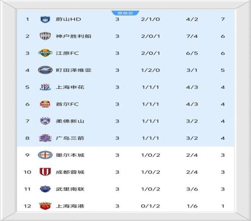 榜首依然是蔚山HD,积7分;神户胜利船和江原FC都是积6分,位列二三位。